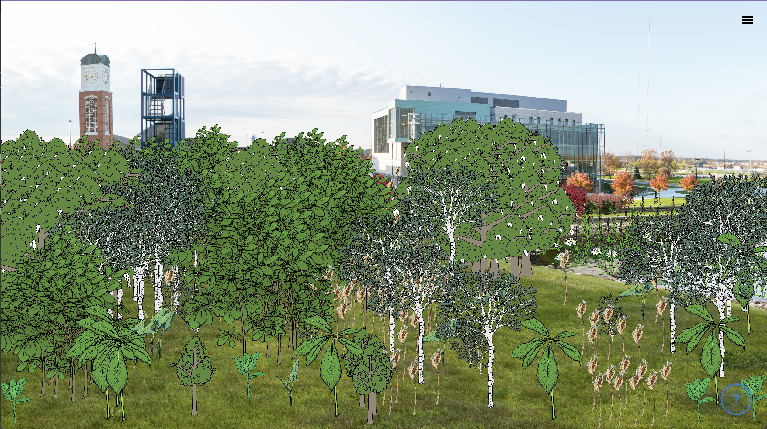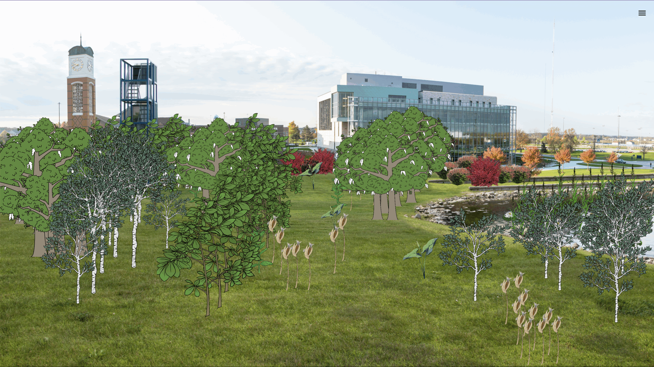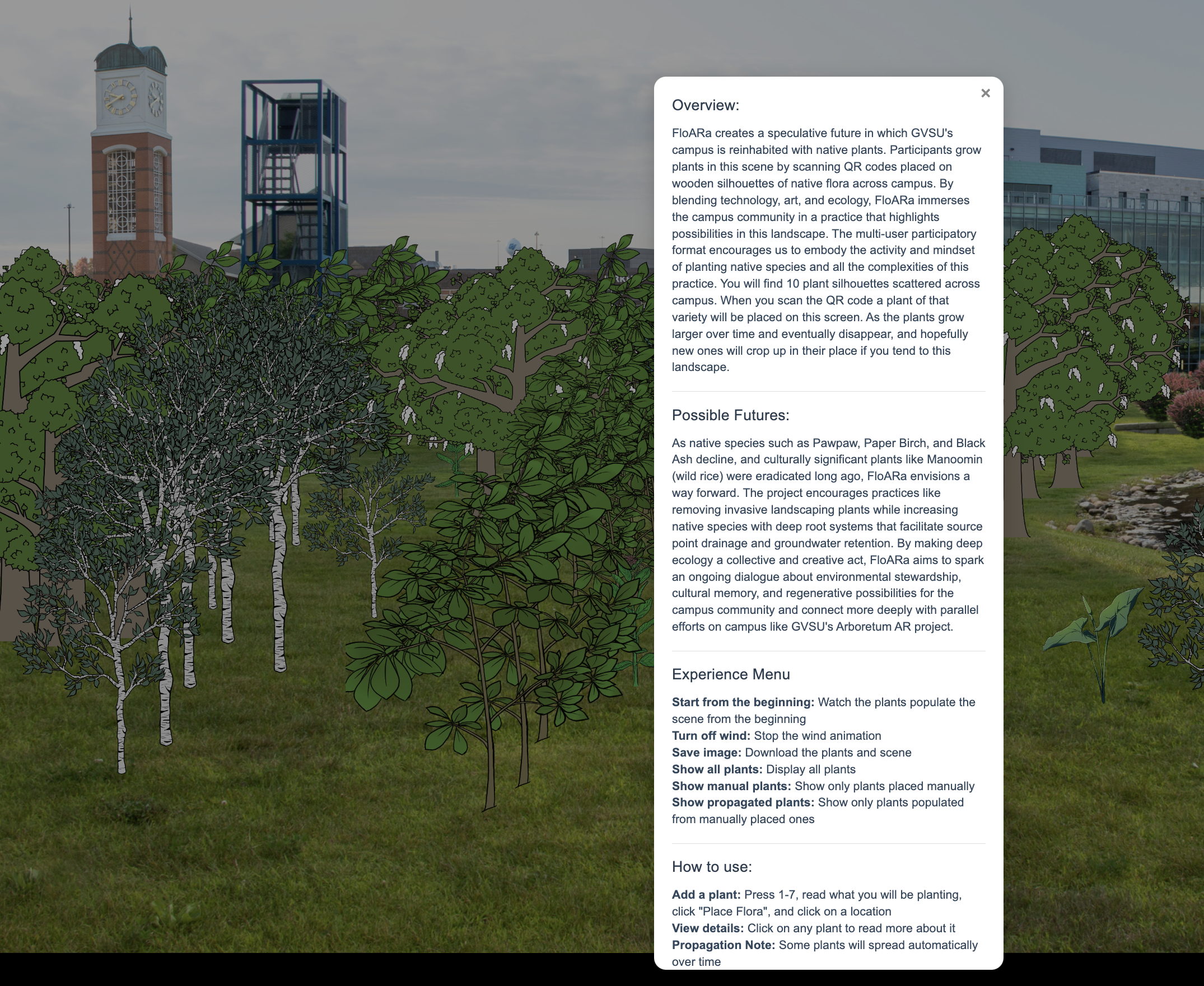 Possible Futures: As native species such as Pawpaw, Paper Birch, and Black Ash decline, and culturally significant plants like Manoomin (wild rice) were eradicated long ago, FloARra envisions a way forward. The project encourages practices like removing invasive landscaping plants while increasing native species with deep root systems that facilitate source point drainage and groundwater retention. By making deep ecology a collective and creative act, FloARra aims to spark an ongoing dialogue about environmental stewardship, cultural memory, and regenerative possibilities for the campus community and connect more deeply with parallel efforts on campus like GVSU’s Arboretum AR project.