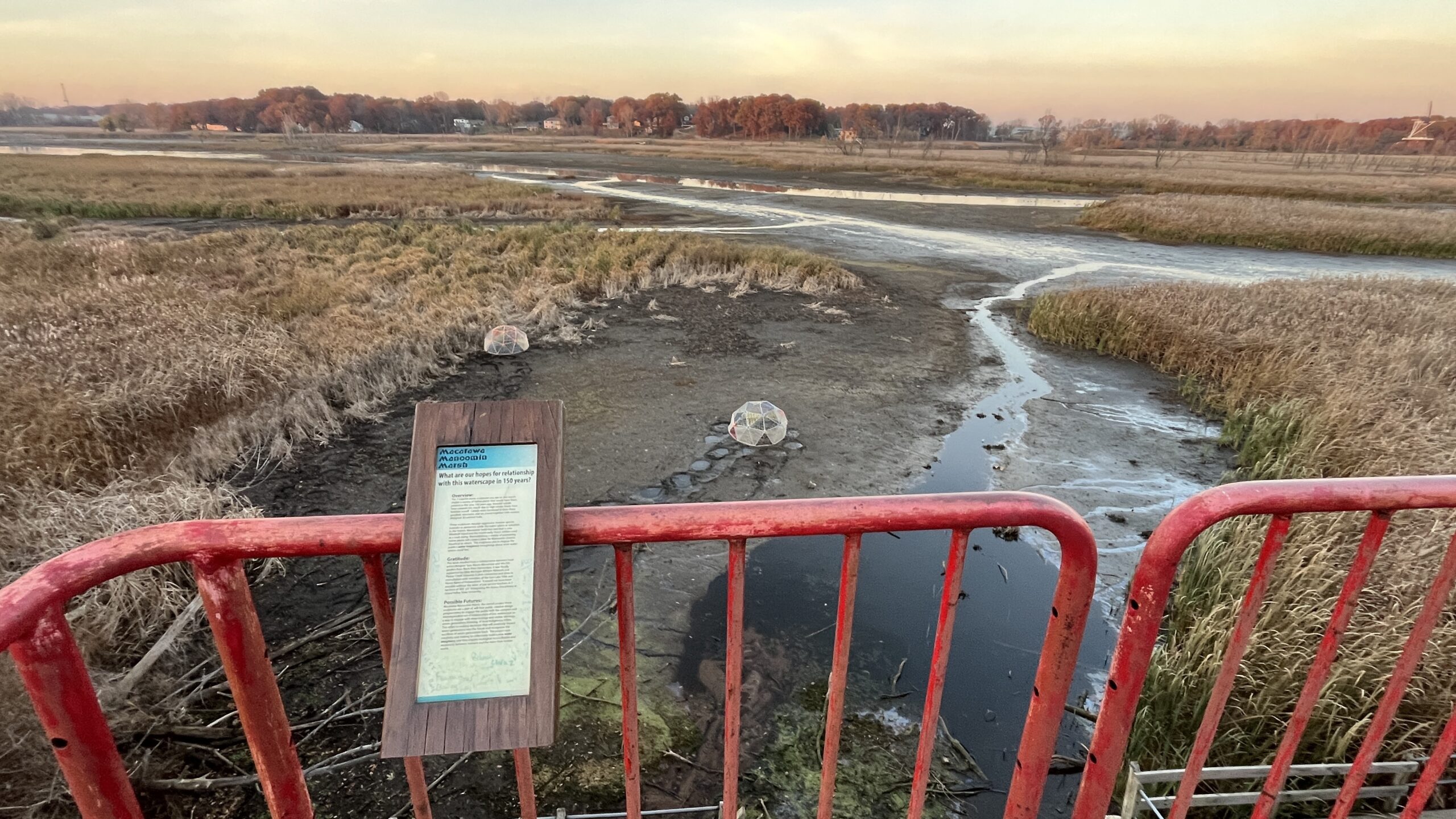 The colorful dome sculptures you see on this marsh shelter a variety of native plants that would have been present in this area 150 years ago. Invasive cattails have covered this marsh due to high nitrate levels from fertilizer runoff. Cattails were harvested to form these geodesic structures and are joined together with custom designed 3D printed hubs.